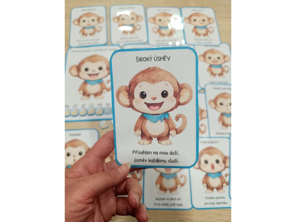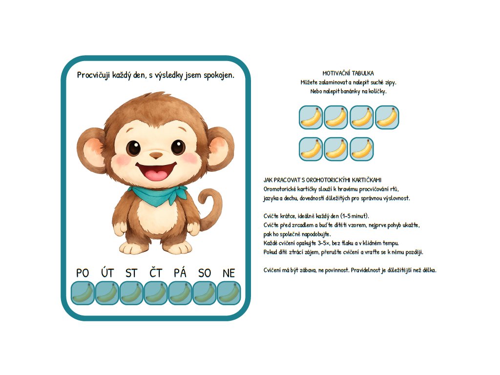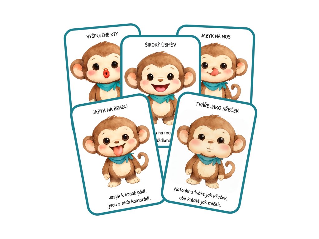 16 oromotorických karet: Každá kartička obsahuje konkrétní cvik (např. vibrování rtů, olizování nosíku, foukání) doprovázený hravou básničkou, která dětem pomáhá pohyb lépe pochopit a zapamatovat si ho.