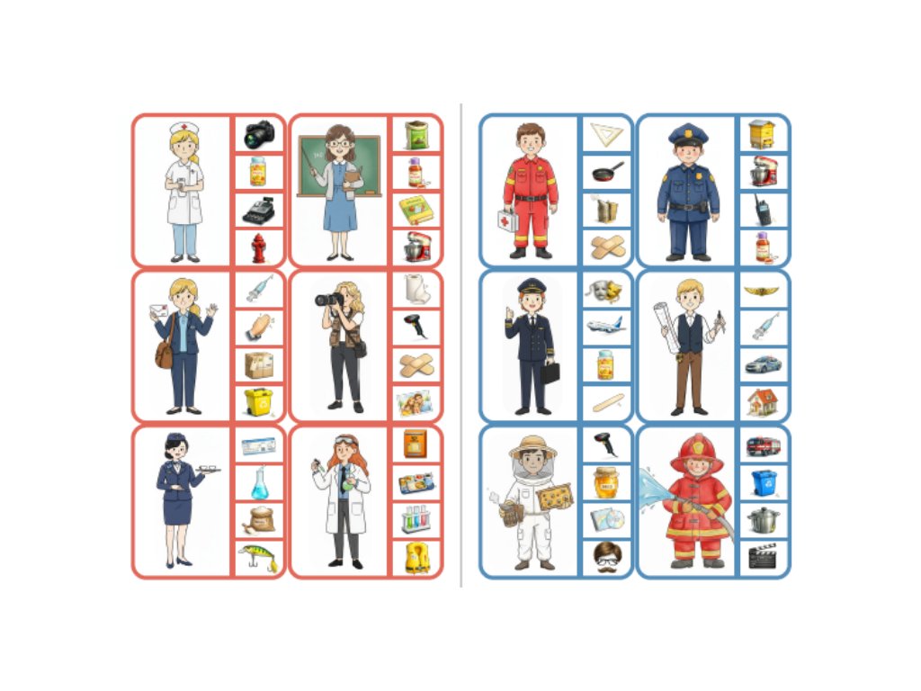Děti si prostřednictvím básniček, hádanek a her upevňují znalosti o jednotlivých profesích, učí se rozpoznávat typické pracovní pomůcky a přemýšlejí nad tím, kdo pracuje venku, kdo pomáhá lidem nebo kdo musí umět spolupracovat.
